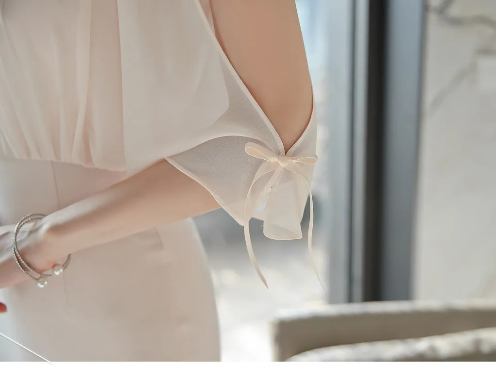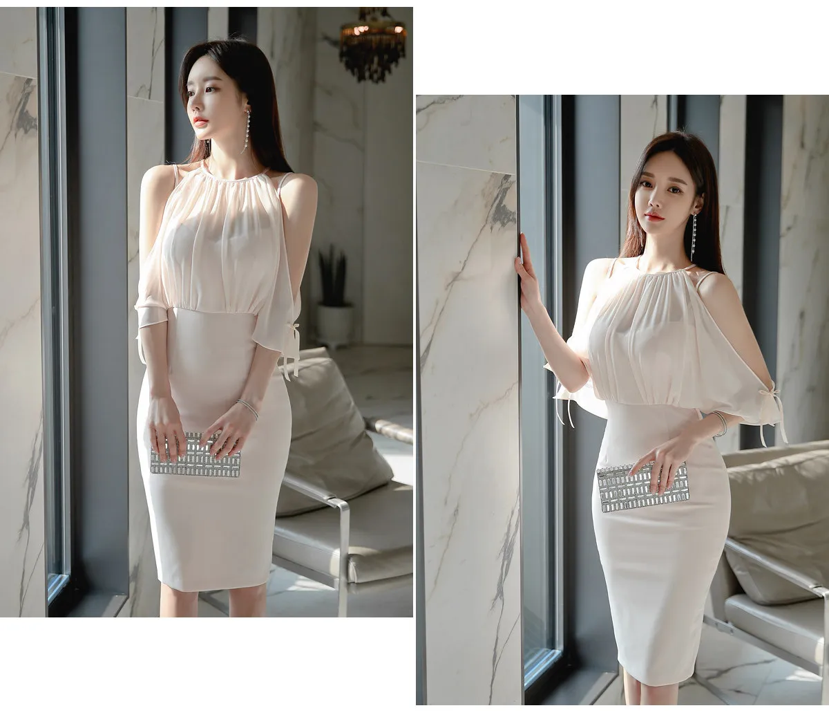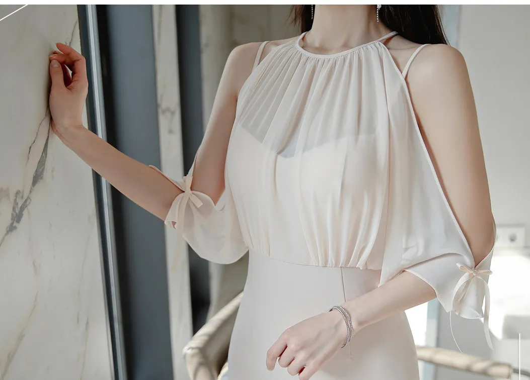 Chiffon material, light and elegant, great touch. The design of the fake two pieces is unique and fashionable, making you stand out in an instant. The style of shoulder-slipping splicing cleverly modifies the shoulder lines. The waist design shows a slimming effect, highlighting your small waist. The version of the hip skirt shows attractive curves, sexy and elegant.